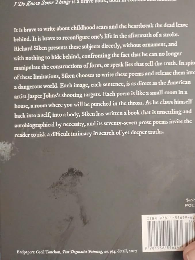 This is a fantastic book of poetry. Readable, accessible, honest, deeply moving. I have been a fan of Sikenβs work and enjoyed his previous work in Crush, and War of the Foxes. This book is different partly because its prose poetry and partly because its memoir and personal accounts about suffering a stroke and family stories, which are not only interesting, but horrific, and recounted in a poetic, condensed and with an original vision and childlike straightforwardness. His best book to date. I have recommended to friends. Donβt miss his interview on Rattlecast!