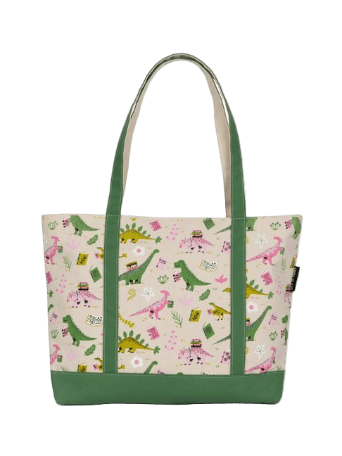 Prehistoric Reads large zippered tote bag - the ultimate bag for dinosaur enthusiasts and book lovers! The tote's eye-catching design features vibrant, playful illustrations of your favorite dinosaurs, capturing the excitement and wonder of the prehistoric world.